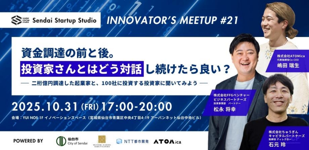 HOME > お知らせ > 10/31(金)「資金調達の前と後。投資家さんとはどう対話し続けたら良い? 〜二桁億円調達した起業家と、100社に投資する投資家に聞いてみよう〜」